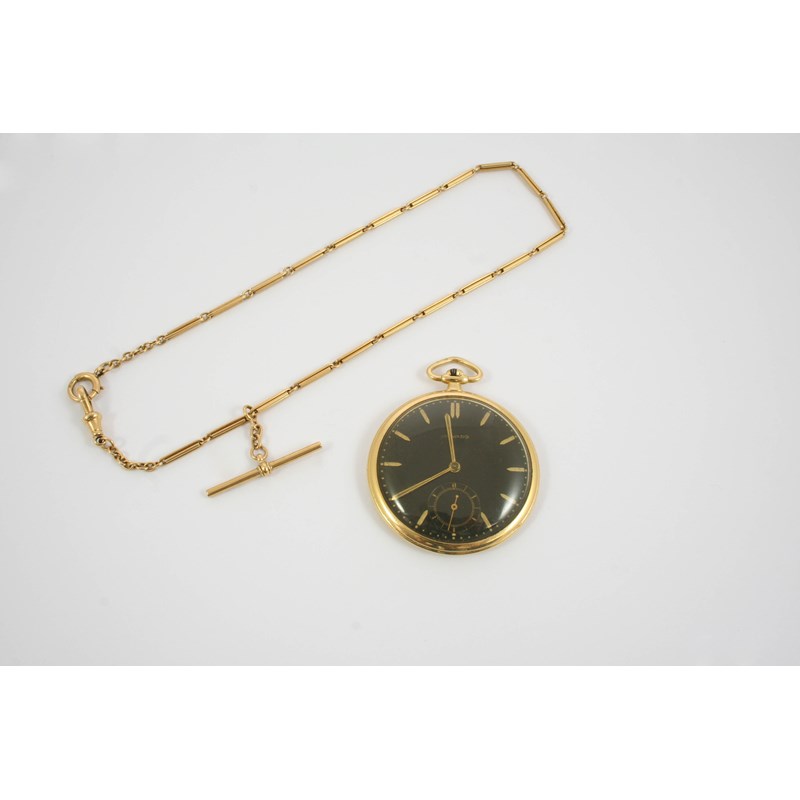 AN 18CT. GOLD OPEN FACED POCKET WATCH BY MOVADO the signed black dial with dagger numerals and subsidiary seconds dial, numbered 253951 2582 to the inside case, the dial 40mm. dia., 39.6 grams., together with an 18ct. gold watch chain, suspending an 18ct. gold 't' bar, 33.5cm. long, 16 grams.
