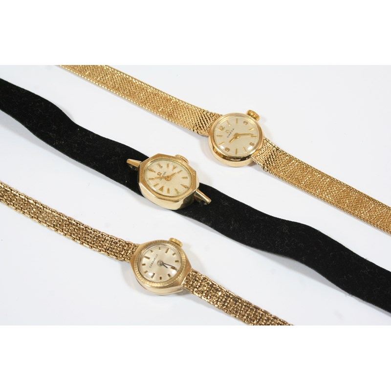 A LADY'S 9CT. GOLD WRISTWATCH BY OMEGA the signed circular dial with Arabic quarters and baton numerals, on an integral 9ct. gold bracelet with ladder clasp, 16.9 grams, together with another lady's 9ct. gold wristwatch, 12.3 grams and a lady's gold wristwatch by Omega, strap missing.