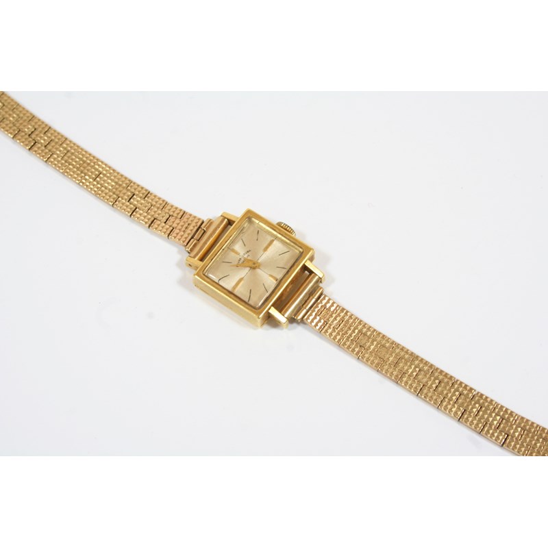 A LADY'S 18CT. GOLD WRISTWATCH BY FAVRE-LEUBA the signed rectangular-shaped dial with baton numerals, on a 9ct. gold bracelet with ladder clasp, 20.6 grams.
