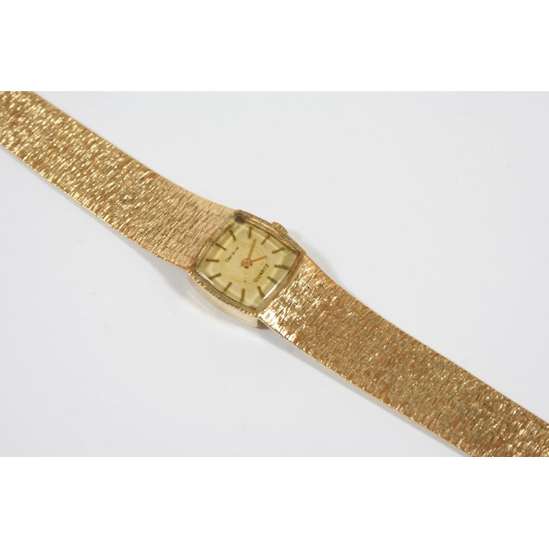 A LADY'S 9CT. GOLD WRISTWATCH the cushion-shaped dial signed Geneve and with baton numerals, quartz movement, on an integral 9ct. gold textured bracelet with ladder clasp, 32.2 grams.