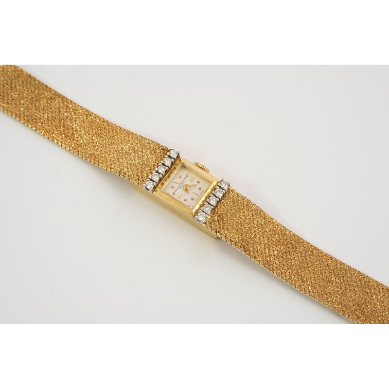 A LADY'S 18CT. GOLD AND DIAMOND WRISTWATCH BY BAUME & MERCIER the signed square-shaped dial with dot and baton numerals, with five circular-cut diamonds set to each side of the bezel, on an integral 18ct. gold textured bracelet, numbered to the reverse 192570 38109.