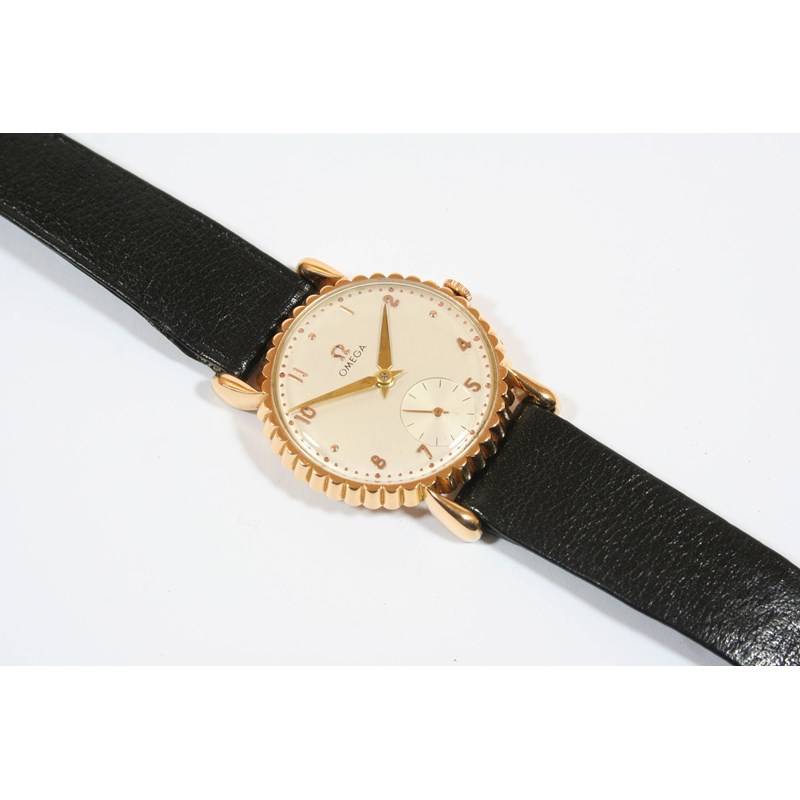 AN 18CT. GOLD MANUAL 'JELLY MOULD' WRISTWATCH BY OMEGA the signed cream dial with Arabic numerals and subsidiary seconds dial, ref 14149, no. 11029828, 32mm. dia., on an Omega black leather strap. Circa 1947.