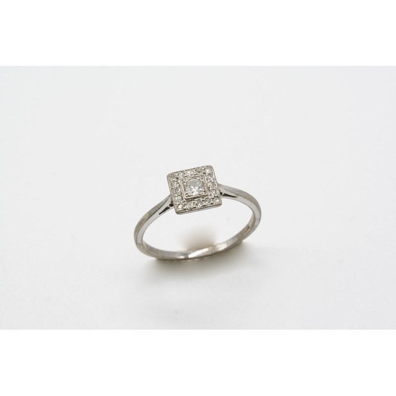the central circular-cut diamond is millegrain set within a square surround of circular-cut diamonds, in platinum. Size Q.