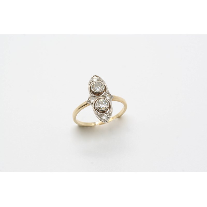 AN EARLY 20TH CENTURY DIAMOND RING centred with two circular old-cut diamonds within a surround millegrain set with four small diamonds, in gold. Size J.