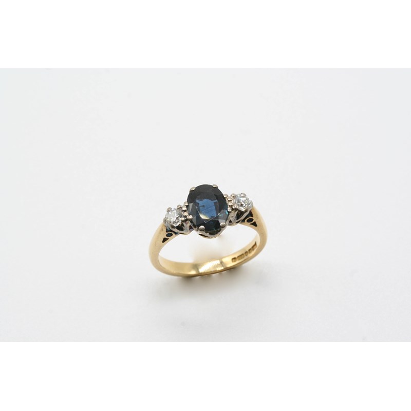 A SAPPHIRE AND DIAMOND THREE STONE RING the oval-shaped sapphire is set with two circular-cut diamonds, in 18ct. gold. Size J.