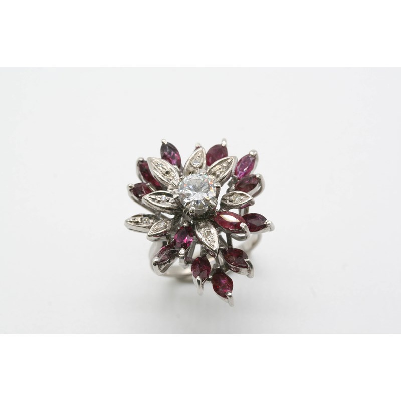 the flowerhead design is centred with a circular-cut diamond, with marquise-cut rubies and circular diamonds set to the petals, in 18ct. white gold. Size L.