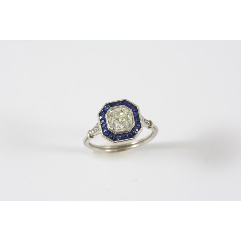 the cushion-shaped diamond weighs approximately 1.35 carats and is set within a surround of calibre-cut sapphires, with three small diamonds to each shoulder. Size M 1/2.