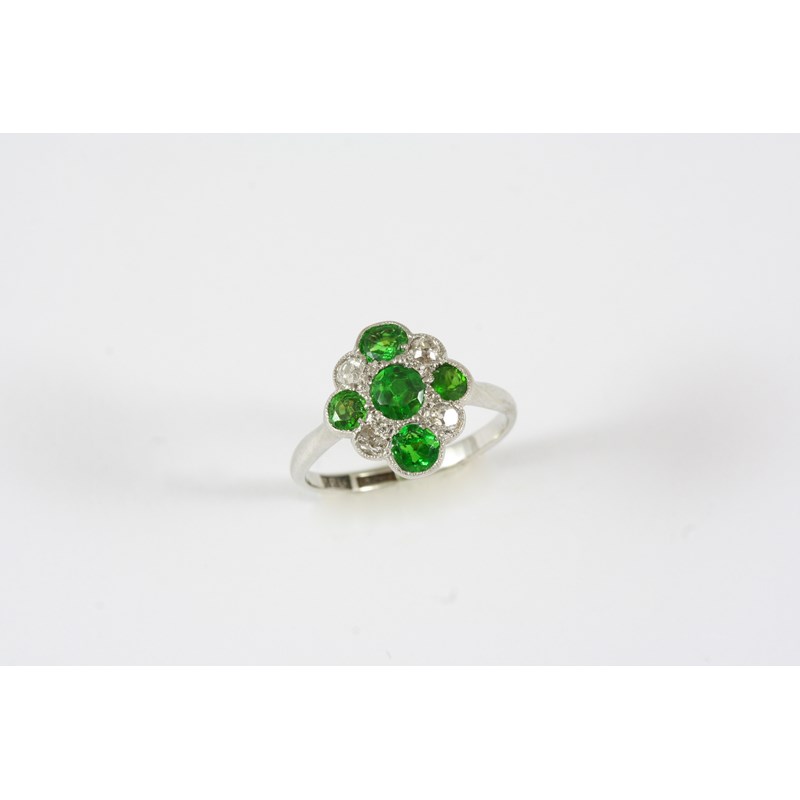 A DEMANTOID GARNET AND DIAMOND CLUSTER RING