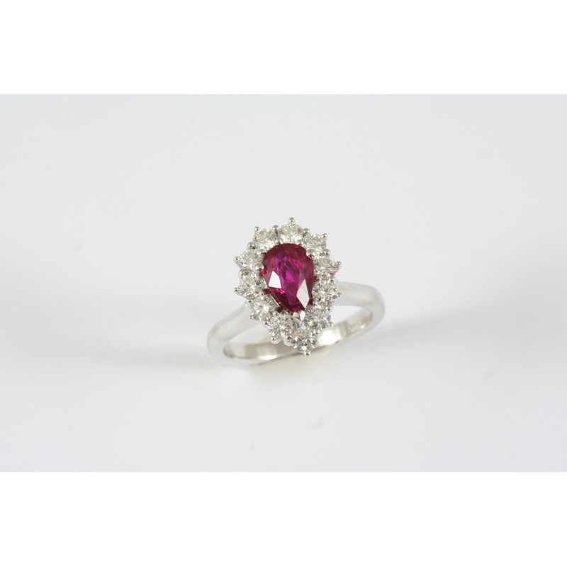 the pear-shaped ruby weighs 1.21 carats and is set within a surround of circular brilliant-cut diamonds, in 18ct. white gold. Size M.