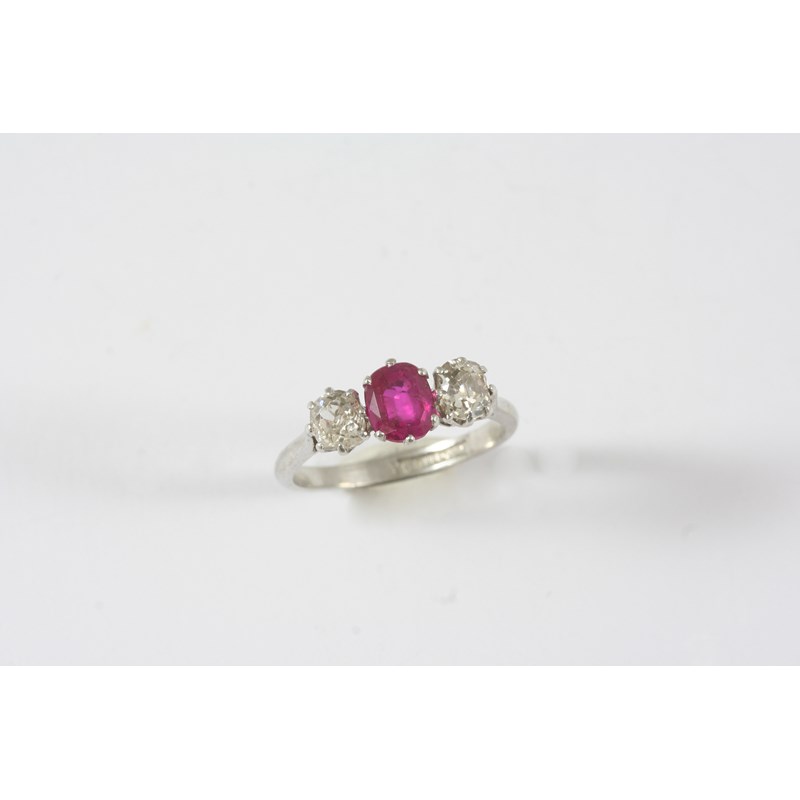 the cushion-shaped ruby is set with two cushion-shaped diamonds, in platinum. Size M 1/2.