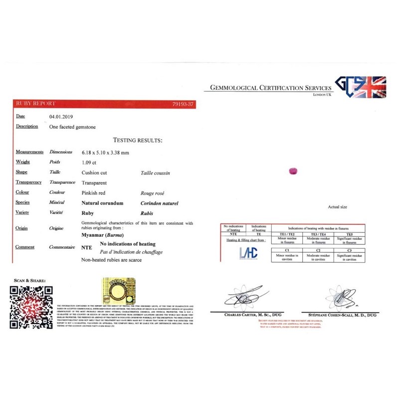Accompanied by report number 79193-37 from GCS dated 4th January 2019 stating that the cushion-cut ruby weighs 1.09 carats and that it is a natural ruby with no indications of heating. Origin: Myanmar (Burma).