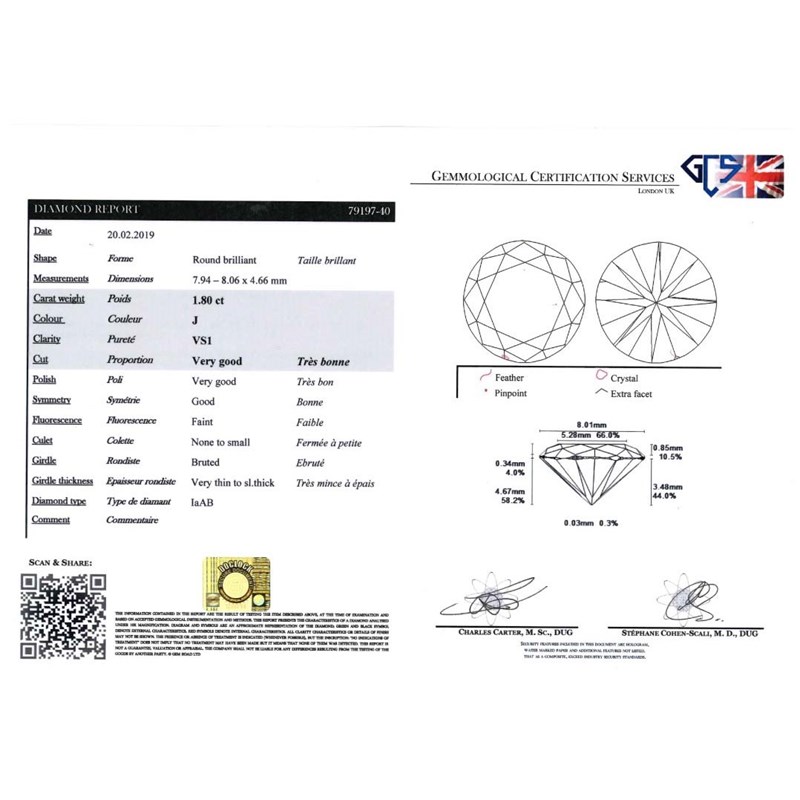 Accompanied by report number 79197-40 from GCS dated 20th February 2019 stating that the round brilliant-cut diamond weighs 1.80 carats and that it has J colour with VS1 clarity.
