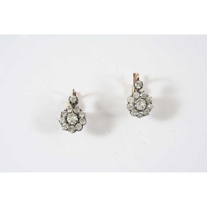 A PAIR OF VICTORIAN DIAMOND CLUSTER EARRINGS each earring of flowerhead form and set with old brilliant-cut diamonds, in silver and backed in gold, 2cm. long.