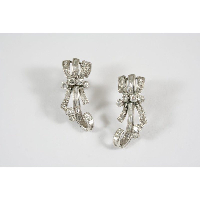 A PAIR OF DIAMOND EARRINGS each earring of scrolling bow design and set overall with baguette-cut and circular-cut diamonds, 3.5cm. long.