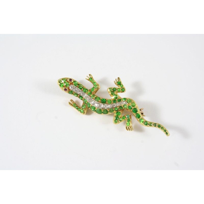 A DIAMOND AND DEMANTOID GARNET LIZARD BROOCH realistically formed and set overall with circular-cut garnets and diamonds, with ruby eyes, in gold, 5.5cm. long.
