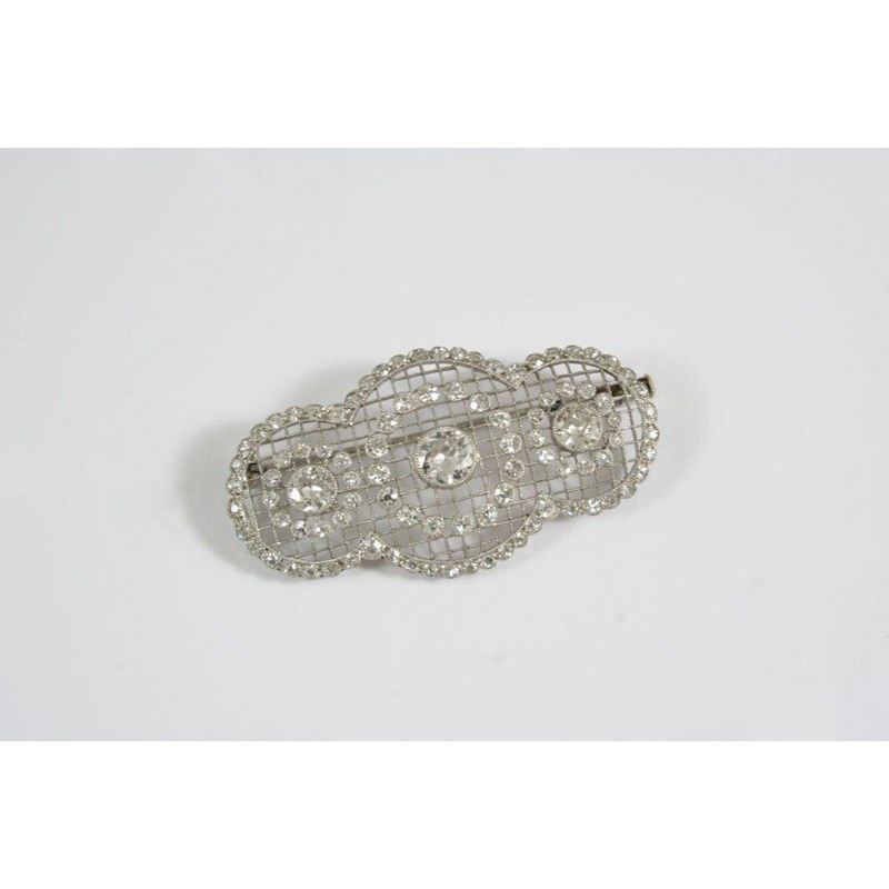 AN EDWARDIAN DIAMOND BROOCH the openwork lattice mount is centred with three circular-cut diamonds in collet mounts and overall with circular-cut diamonds, with French marks to the mount, one for platinum, 5cm. wide.