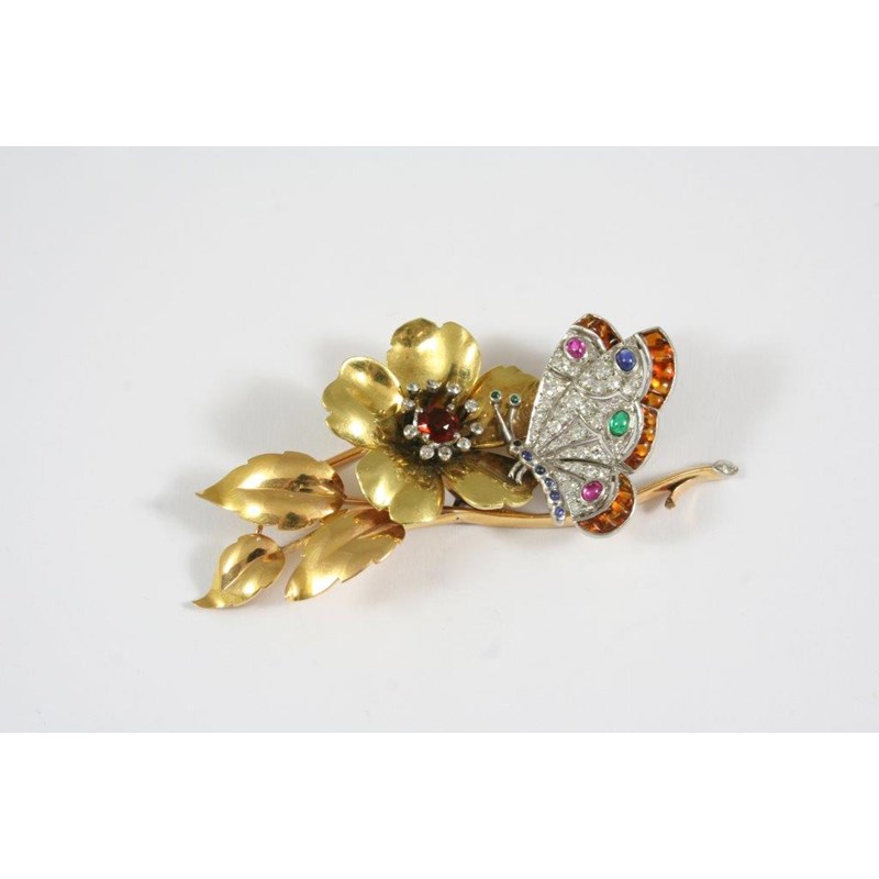 the gold flowerhead is centred with a circular-cut citrine with diamond set stamens, the butterfly set overall with single-cut diamonds and mounted with sapphire, emerald, ruby and citrine cabochons, 6.5cm. long.