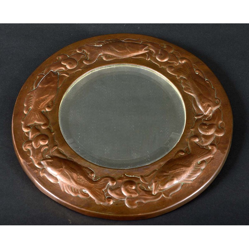NEWLYN STYLE ARTS & CRAFTS MIRROR a circular copper mirror, with a raised design of Fish around the rim and with a bevelled glass plate. Unmarked. 12 1/4ins (31cms) diameter