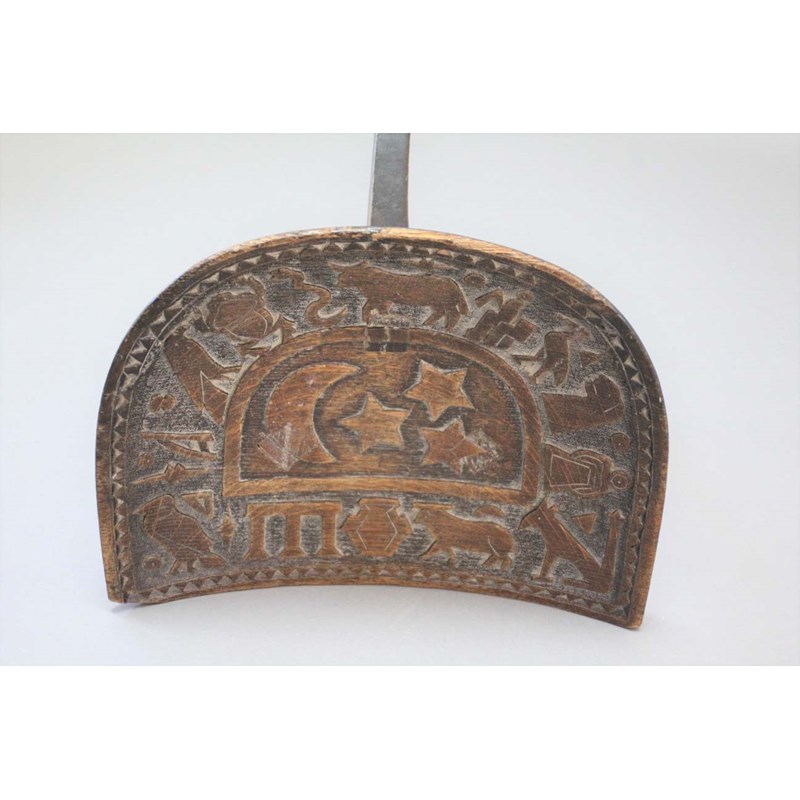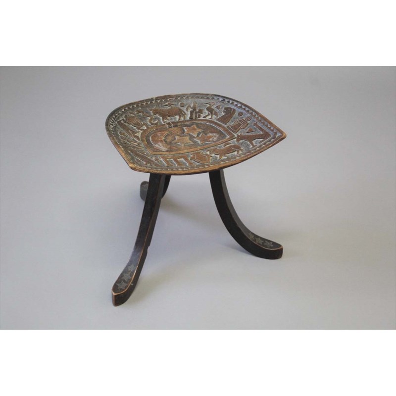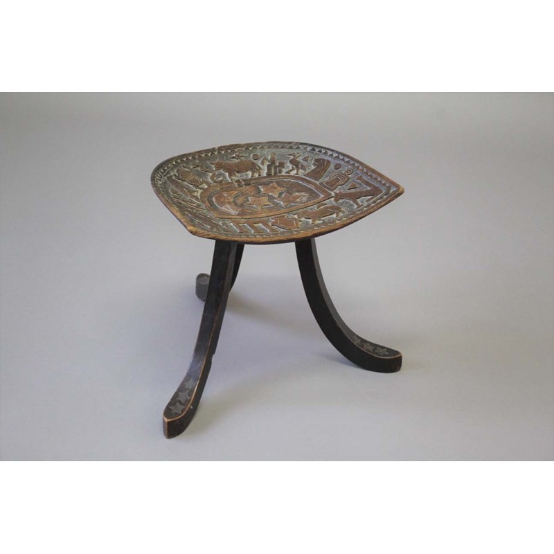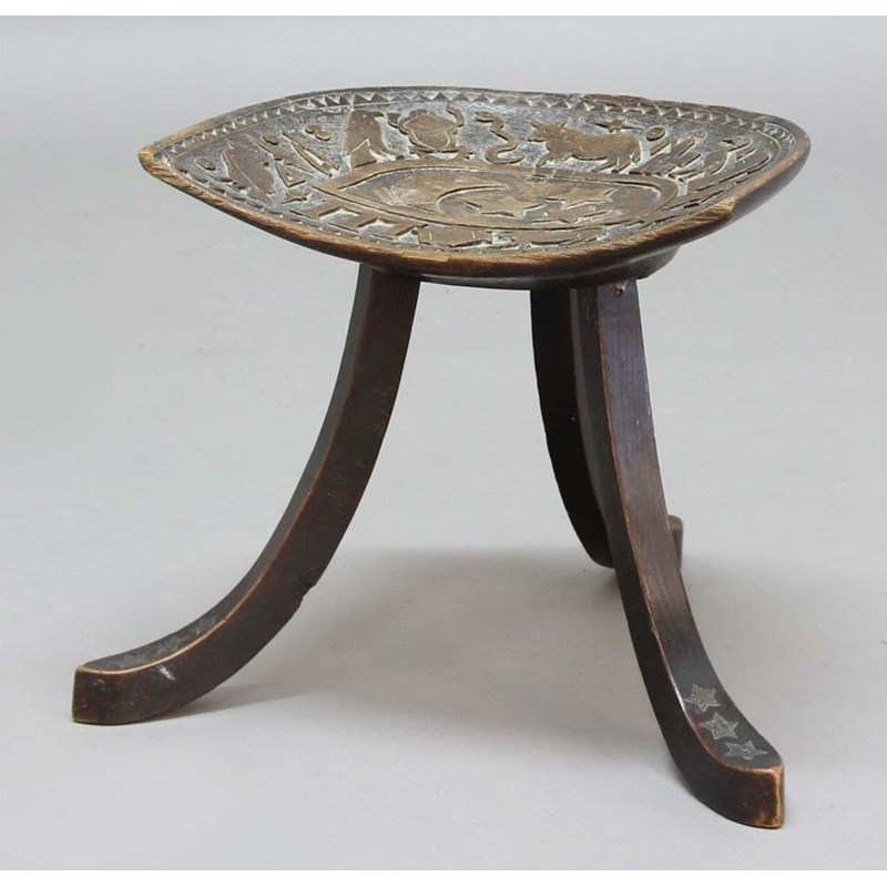 probably retailed by Liberty & Co, made in oak with a dish shaped top and supported on three splayed legs. The top carved with a variety of figures and animals, and with a crescent moon and stars in the centre. 35cms high, 36cms across