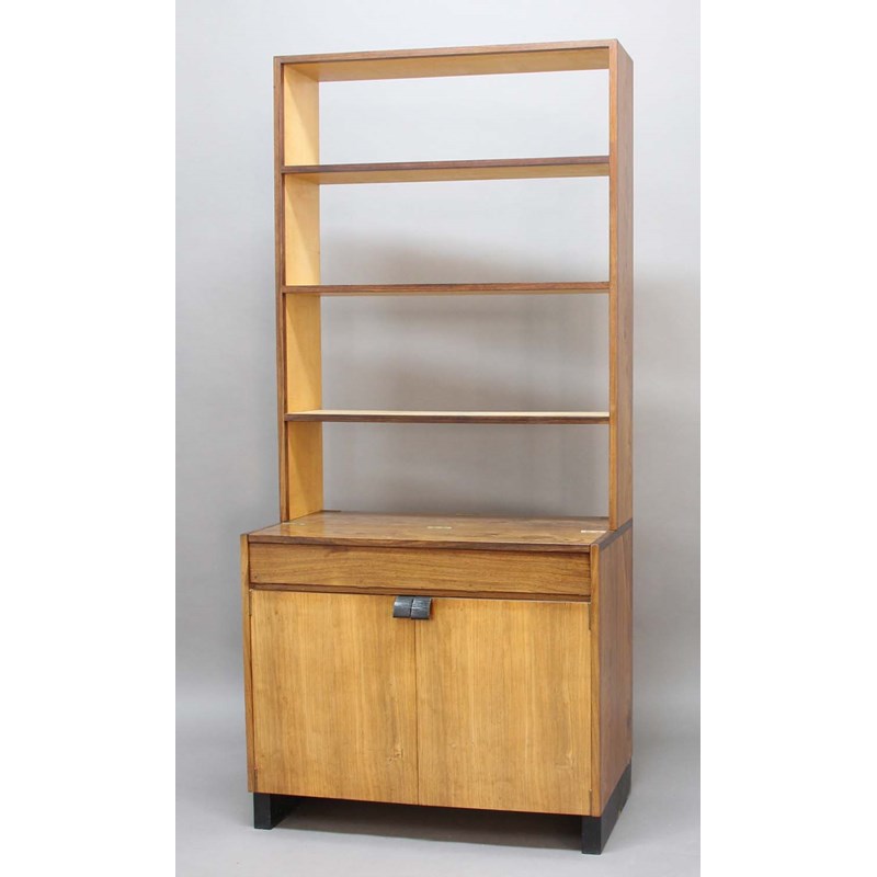 the top section with 3 sycamore and rosewood open shelves. The bottom section with a hinged top to reveal a cut out section (possibly for a television or record player), and with cupboards below and leather tab handles. 78ins (198cms) high