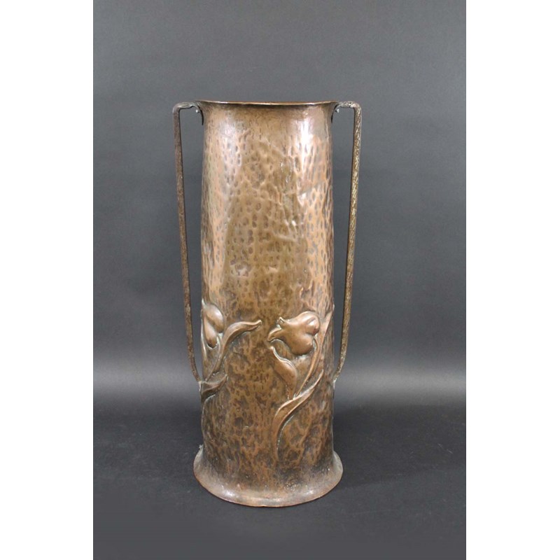 ARTS & CRAFTS COPPER STICK STAND a large stick stand with a hand beaten finish and exposed rivets, with a raised floral design on each side and handles on each side. 59cms high