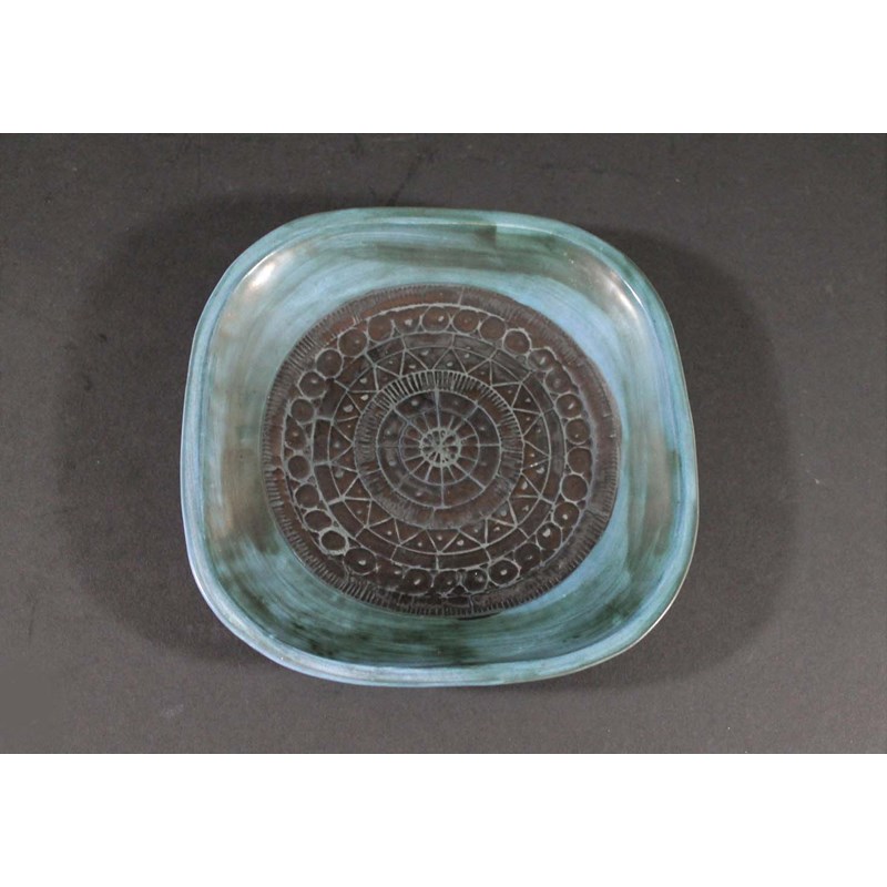 a D shaped plate with an abstract design in the centre and blue glazed ground. Impressed marks, Troika, Trident mark, St Ives. 7 1/2ins (19cms) square