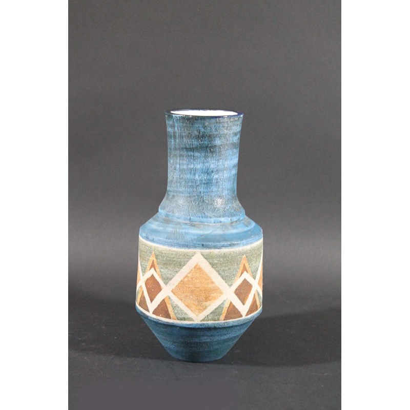 TROIKA VASE - HOLLY JACKSON the vase with a band of decoration around the centre, and with a blue glazed ground. Painted marks, Troika, Cornwall, and monogram for Holly Jackson. 10ins (25.5cms) high