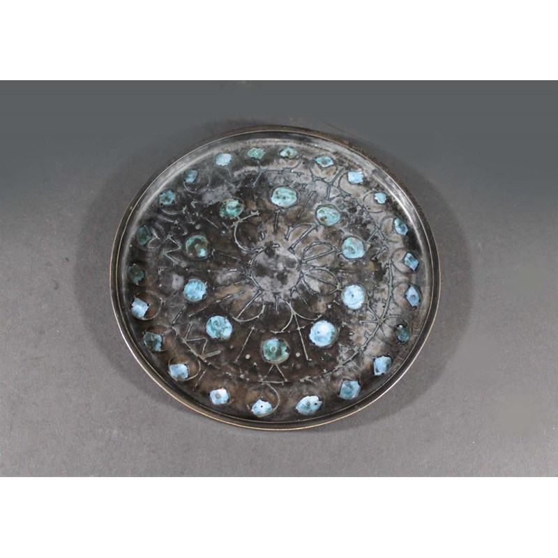 TROIKA CIRCULAR PLATE - TRIDENT MARK a circular plate with a floral design and black glazed ground. Impressed marks, Troika, Trident Mark, St Ives. 9ins (23cms) diameter