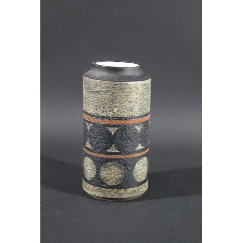 a cylindrical lipped vase, with a disc design on a buff ground. Painted marks, Troika, St Ives, and monogram mark for Benny Sirota.