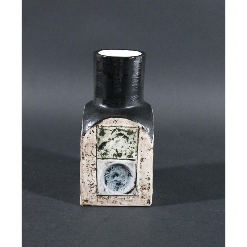 TROIKA SPICE JAR the jar with an abstract design on each side, and with a black glaze around the rim. Painted marks, Troika, St Ives, England, and monogram mark for Marilyn Pascoe. 6 1/4ins (16cms) high