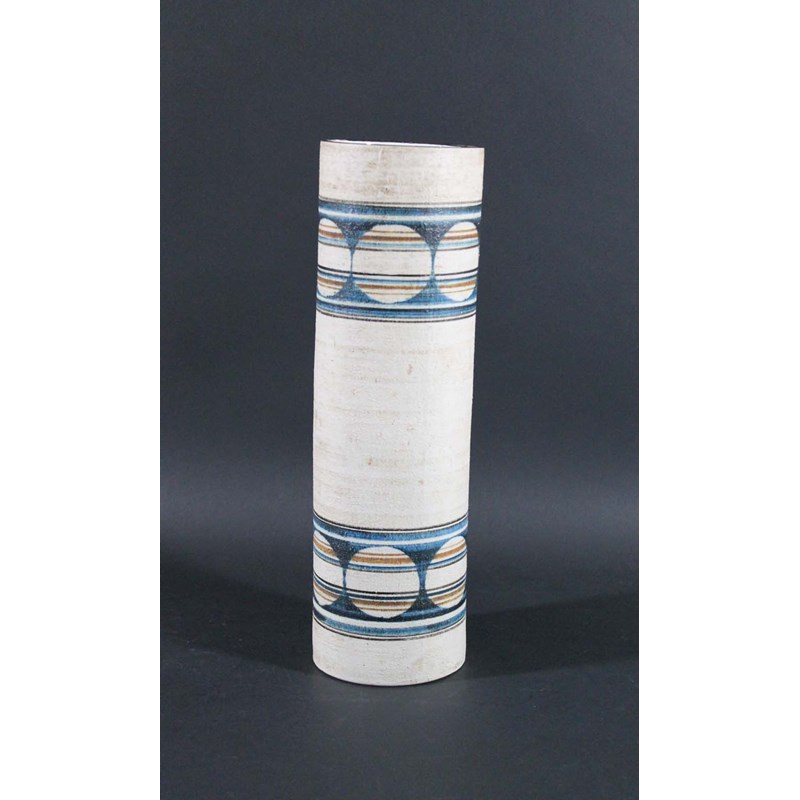 LARGE TROIKA VASE a large cylindrical vase, with two bands of painted decoration on a buff ground. Painted marks, Troika, Cornwall, and monogram mark for Anne Lewis. 14 1/2ins (37cms) high