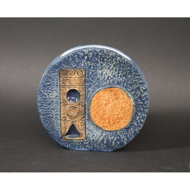 TROIKA WHEEL VASE the circular vase with a stylised design to both sides, against a blue ground. Painted marks, Troika, and monogram mark for Vicky Drew. 4 1/2ins (11.5cms) high