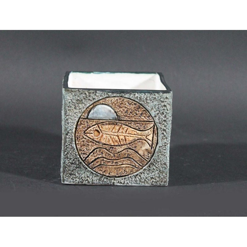 TROIKA CUBE VASE with an abstract design on each side, one side with a depiction of a Fish within a disc shape. Painted marks, Troika, and monogram mark for Alison Bridgen. 3 1/2ins (9cms) square