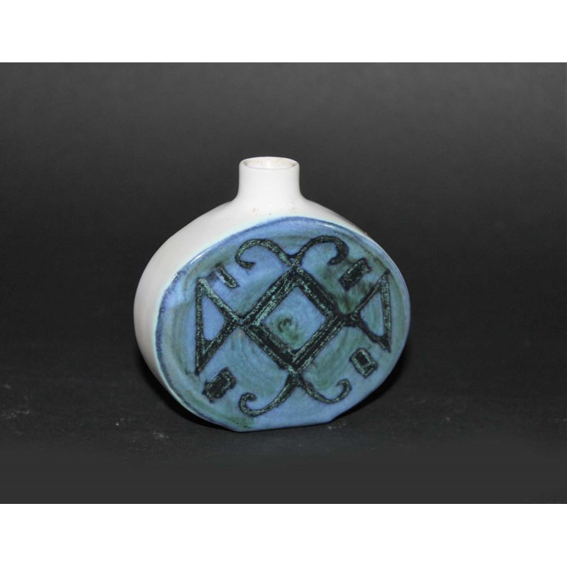 a small scent bottle, painted on one side with an abstract design on a blue ground. The remainder of the scent bottle with a smooth white glaze. Printed marks, Troika, St Ives, England. 2 3/4ins (7cms) high