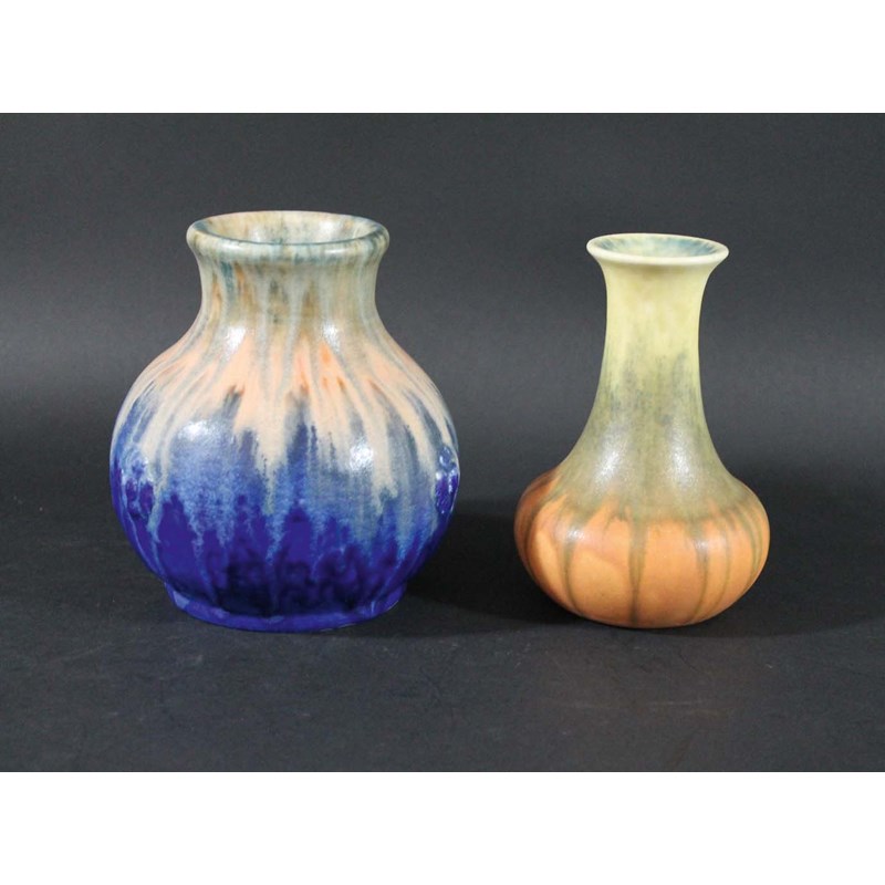 a crystalline glaze vase with floral rosettes around the body. Also with another Ruskin crystalline glazed vase, dated 1932. Larger vase marked, Ruskin (mark partially obscured by the glaze), England. 6 1/4ins (16cms) high. (2)