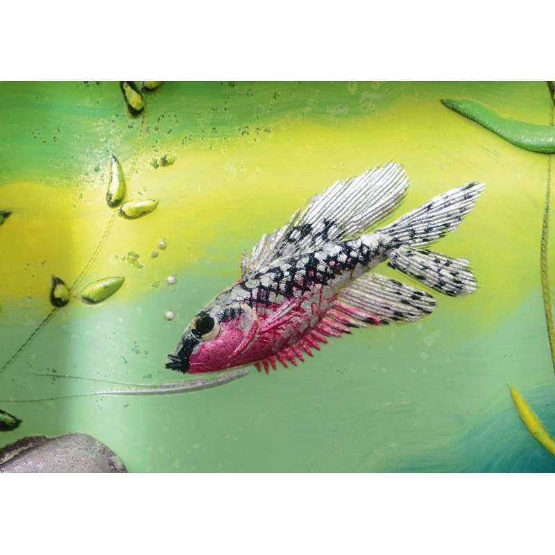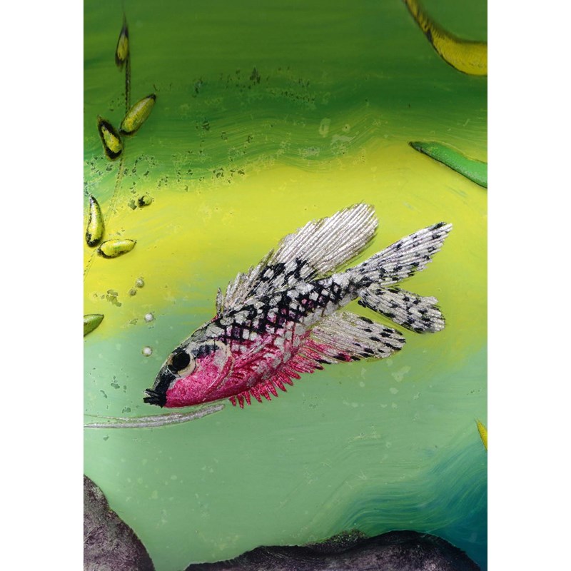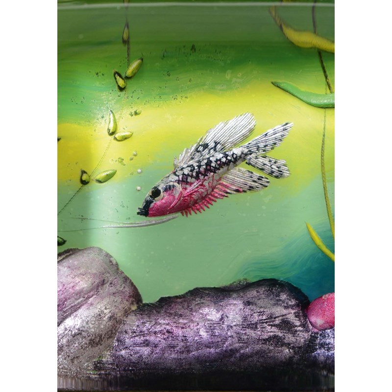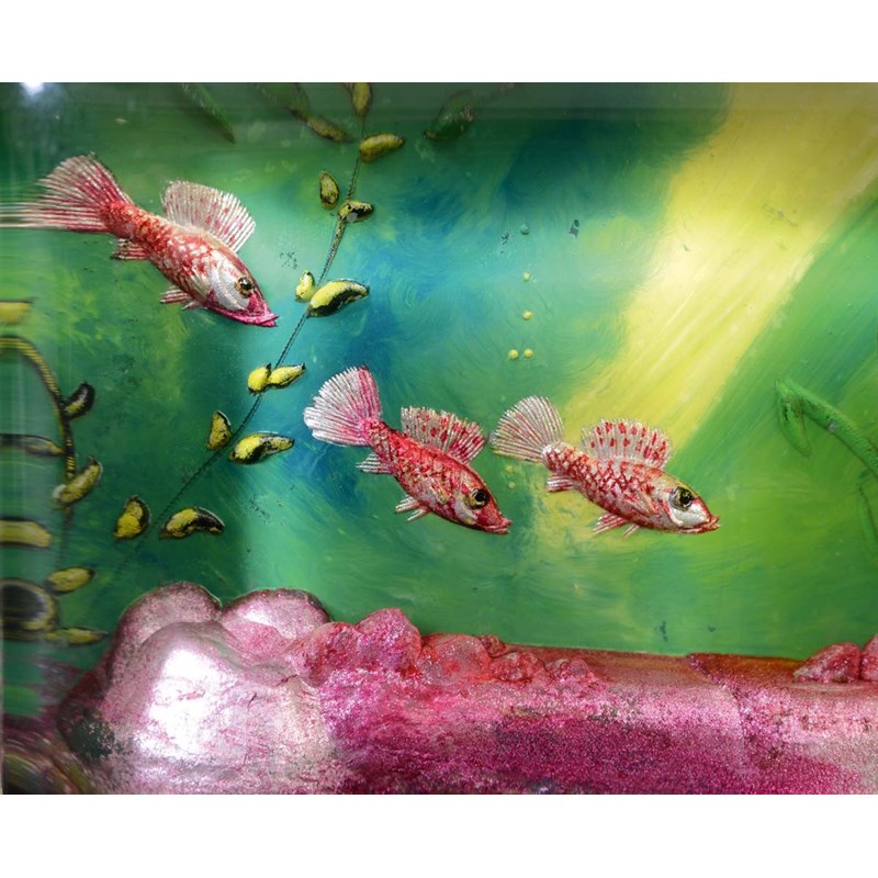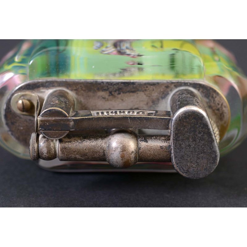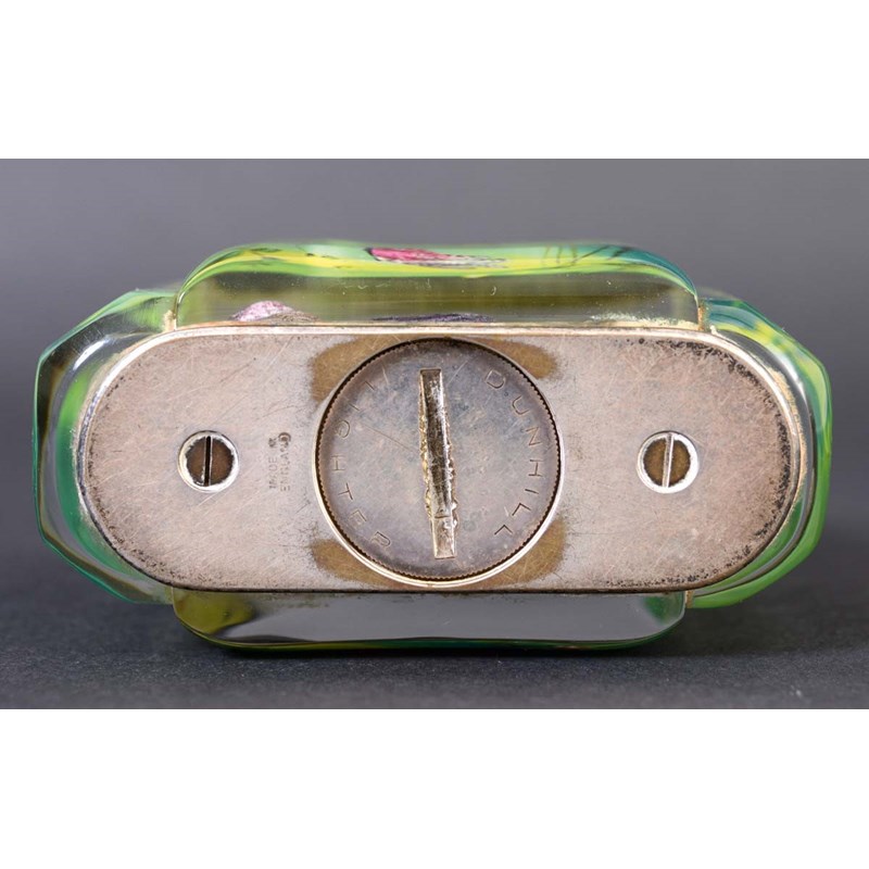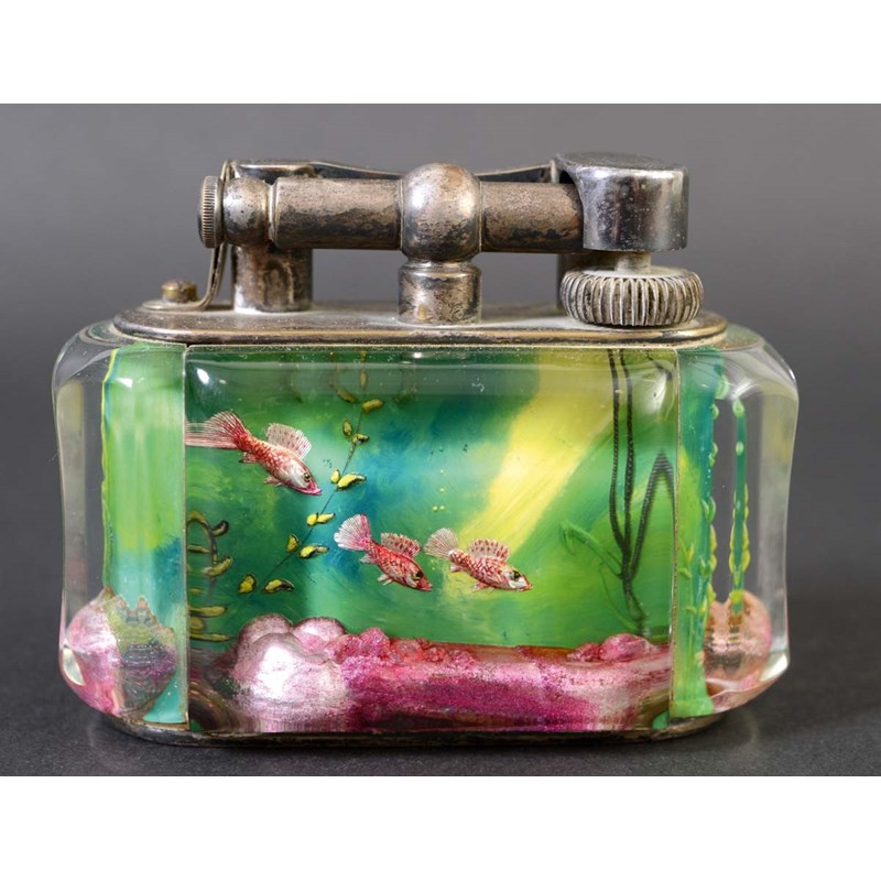 each side painted with Fish in an aquatic landscape, with lucite panels and plated metal mounts. Marked on the metal mount, Dunhill, Reg No 737418, and on the base Dunhill, Made in England. 8cms high, 9 1/2cms across