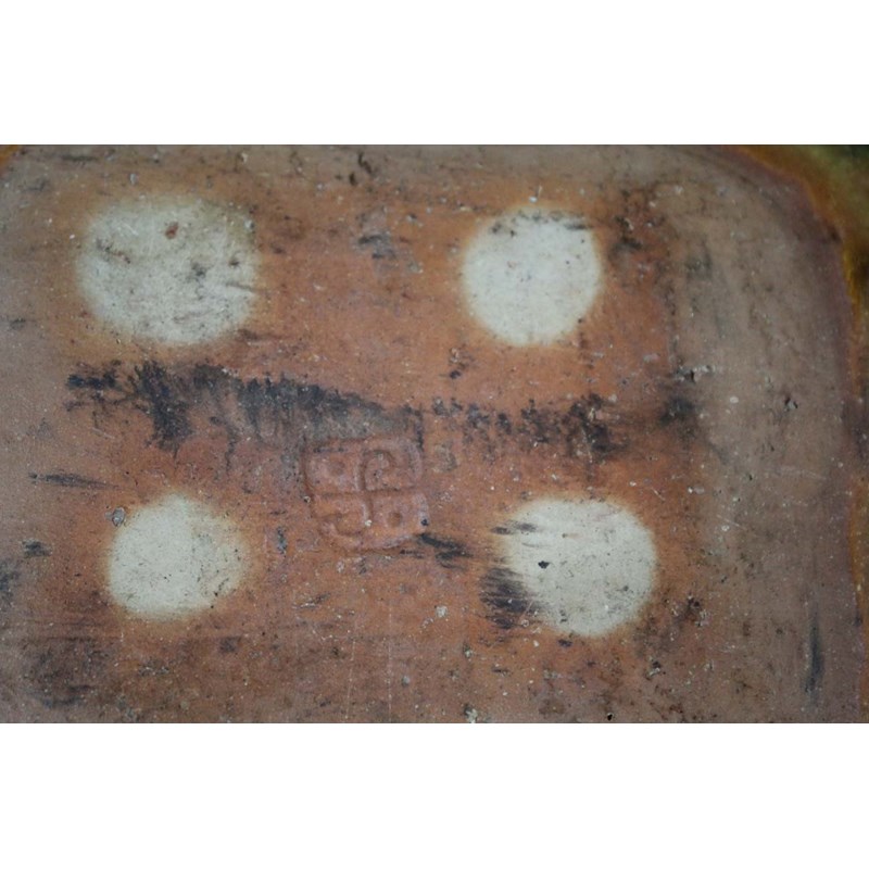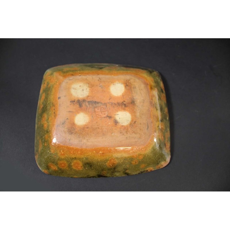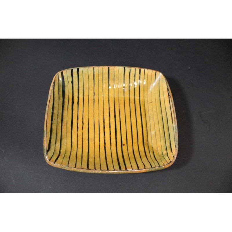EARLY ST IVES SLIPWARE DISH the dish with a slipware glaze with black vertical lines. Impressed St Ives seal mark. 22cms by 19.5cms