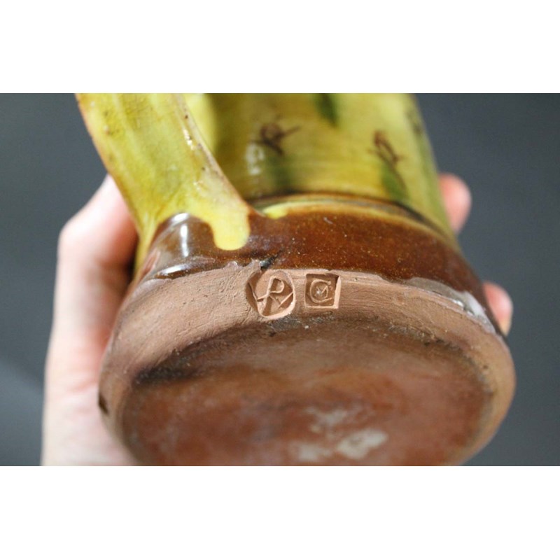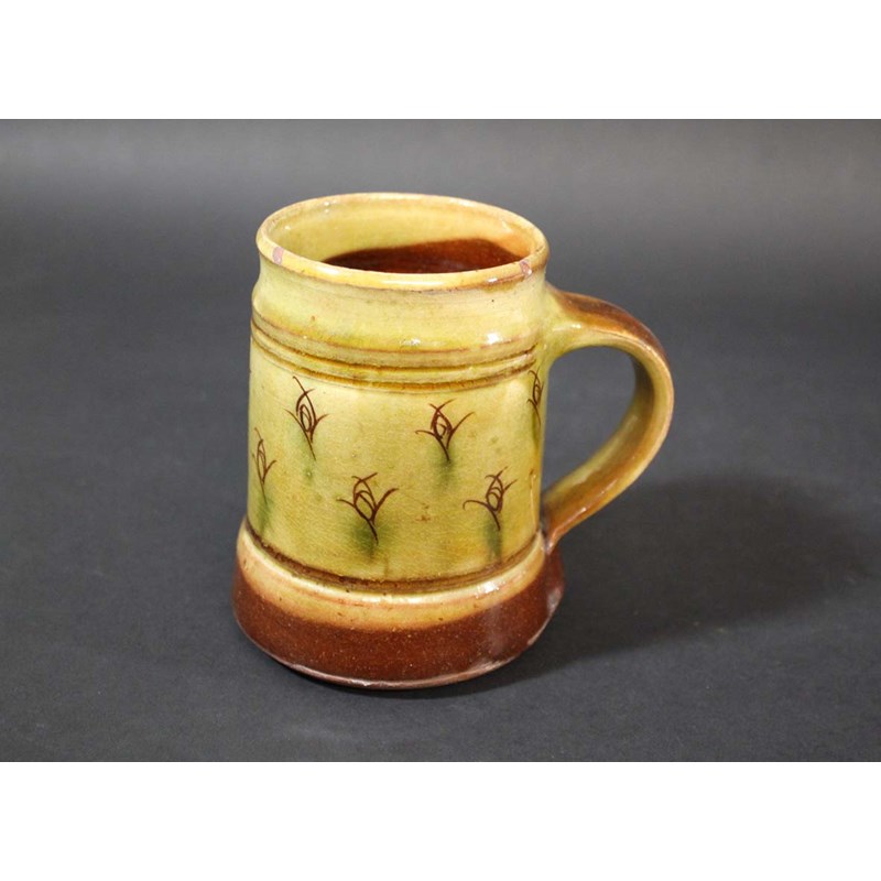 an earthenware tankard with a brown and green slip, with decorative motifs around the centre. Couple of chips to the rim. Impressed seal marks for Michael Cardew and Winchcombe. 5ins (12.5cms) high