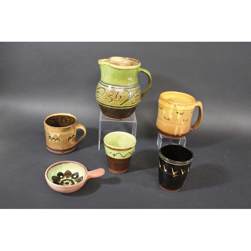 including a jug by Sidney Tustin, a small tankard by Ray Finch, a beaker by Sidney Tustin (damaged), a small dish by Tustin, and 2 other items of Winchcombe Pottery. Jug 6 1/4ins (16cms) high. (6)