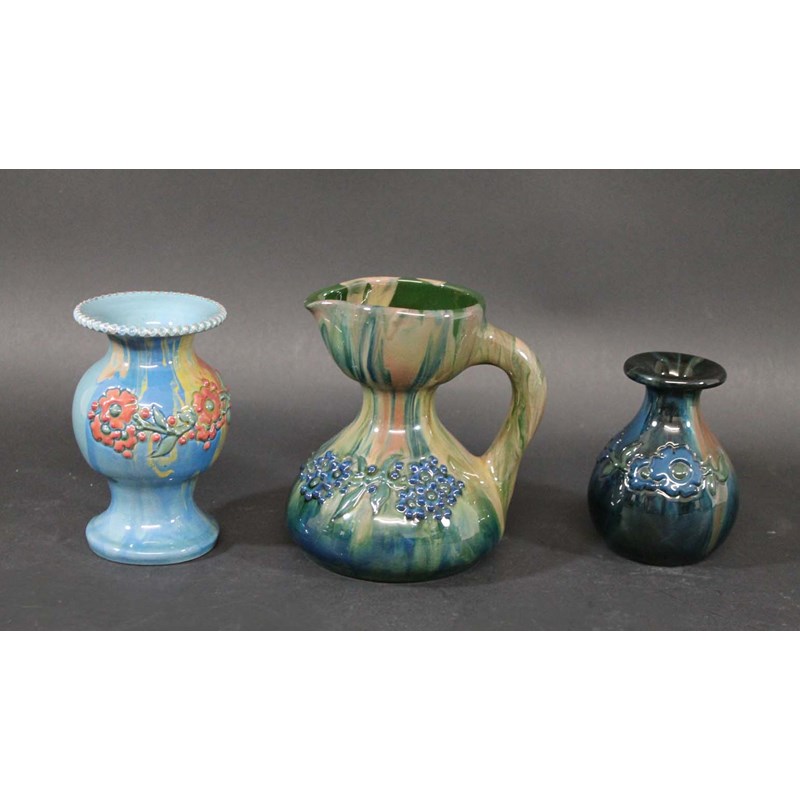 including a jug designed with leaves and berries and a drip effect glaze. Also with 2 Elton pottery vases. All with painted mark, Elton. Jug 5 1/4ins (13.5cms) high. (3)
