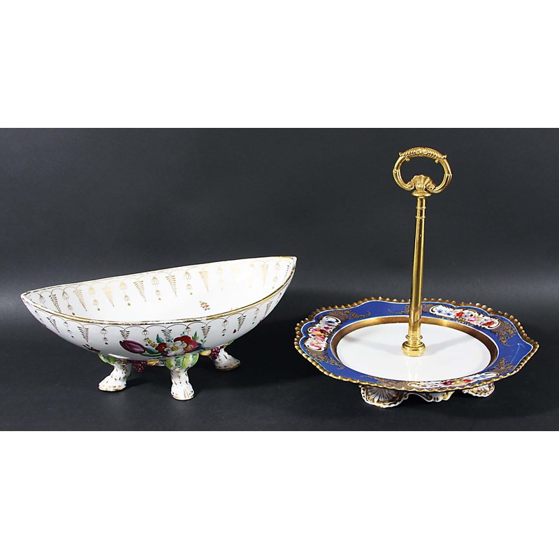 mid 19th century, of navette form painted with flowers, on four hoof feet, length 34cm; together with an English porcelain cake plate with painted floral panels on a matt blue ground border, diameter 30cm (2)