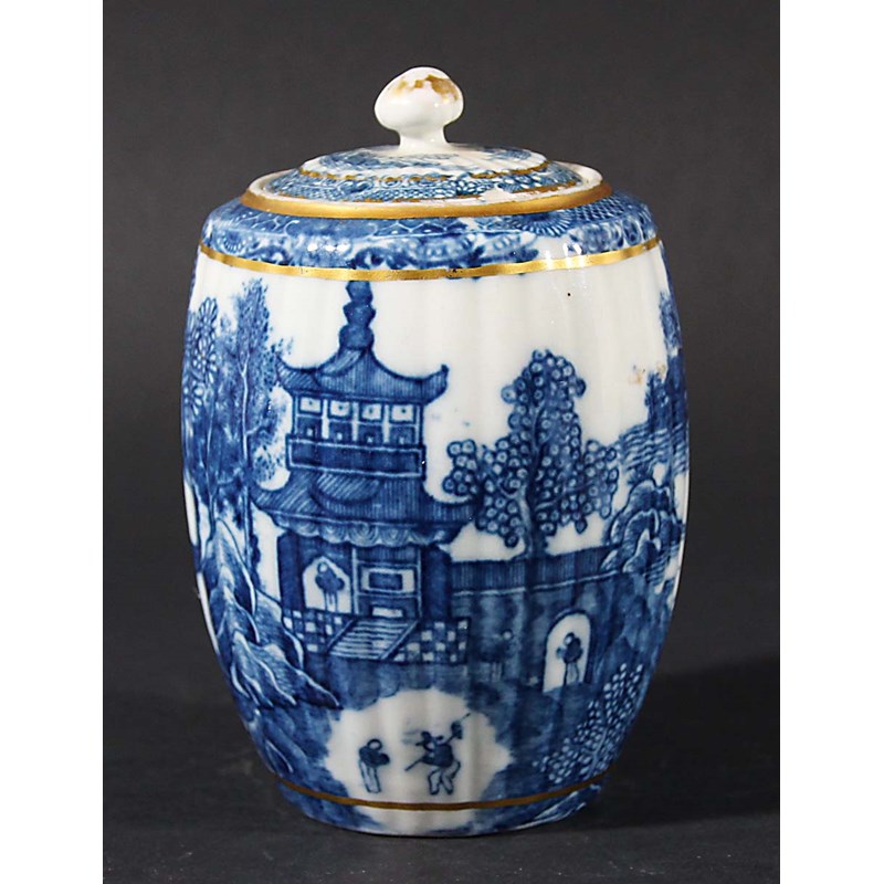 CAUGHLEY TEA CANISTER, circa 1780, of reeded barrel form, blue printed in the Temple pattern, the cover with flower bid finial, height 11.5cm