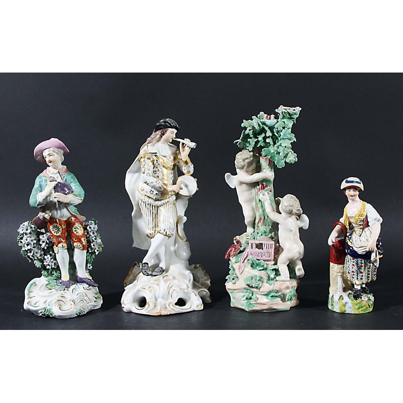 late 18th century, modelled as two cherubs by a tree, two baskets on the ground, incised N 8, height 20cm; together with a Derby musician playing bagpipes, height 18cm; a lady gardener standing with a watering can by a spring, incised and painted marks, height 14cm; and a Derby Musician, with gilt decoration, playing a recorder and tambourine, iron red painted mark, height 20cm (4)