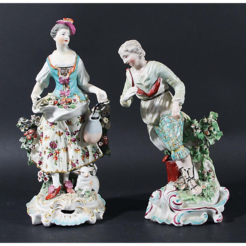 DERBY PATCH MARK FIGURE OF A GARDENER, late 18th century, before bocage and with a watering can on the ground, height 22.5cm; together with a similar figure of a lady holding a pilgrims flask, height 26cm (2)