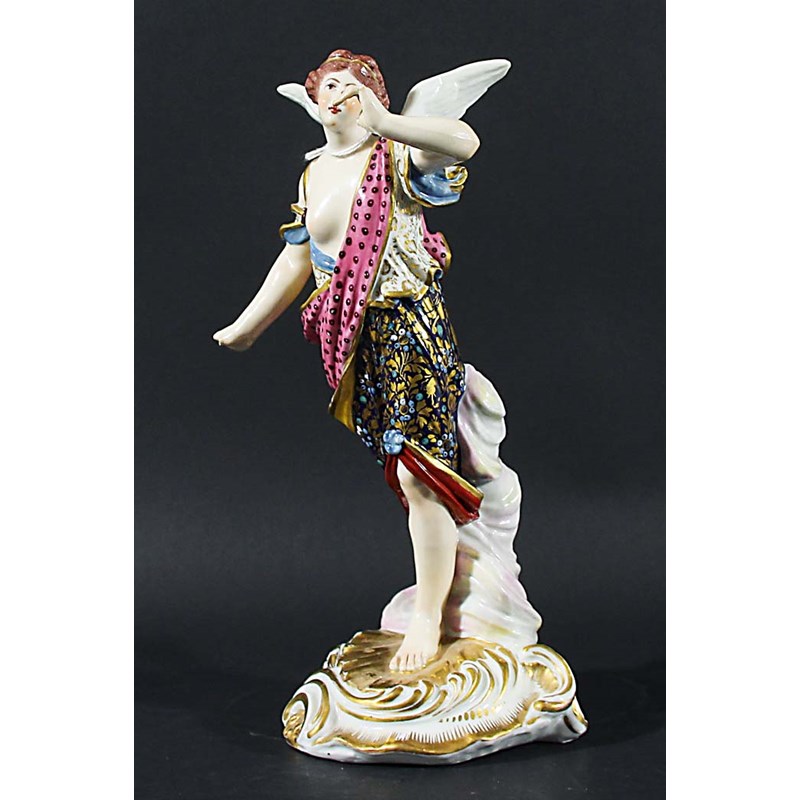 DERBY STYLE FIGURE OF FAME, standing with one arm raised, on a gilt, scrolling base, iron red marks, height 28cm