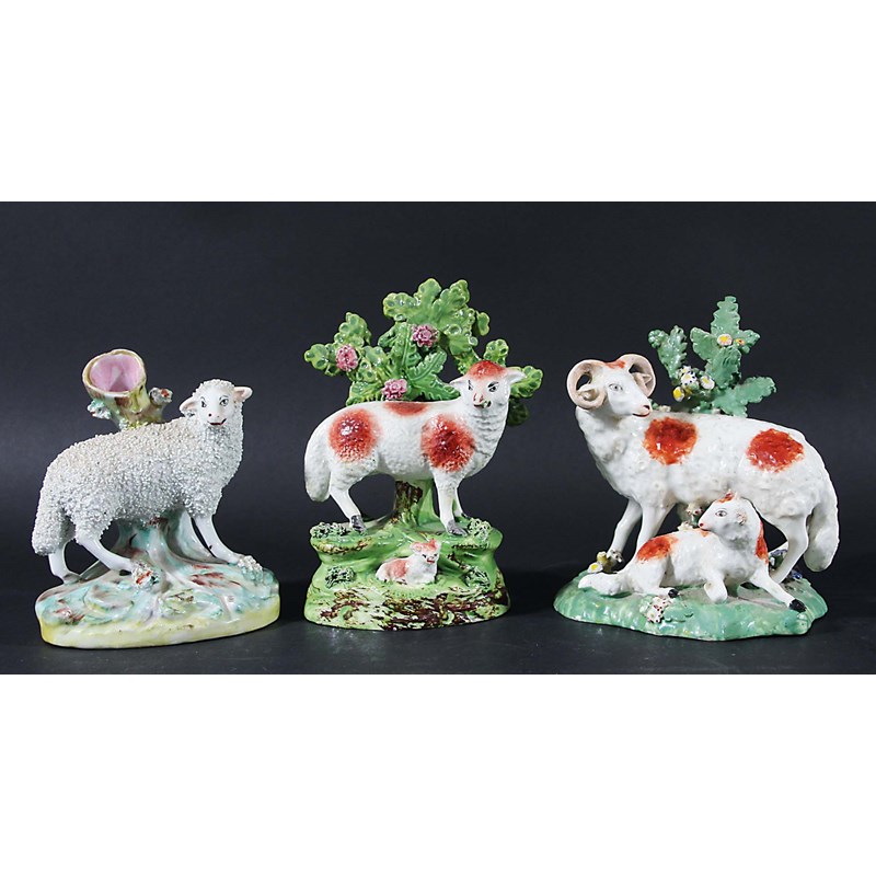 circa 1800, standing before bocage, height 14cm; together with a similar pearlware group and a Staffordshire sheep spill vase (3)