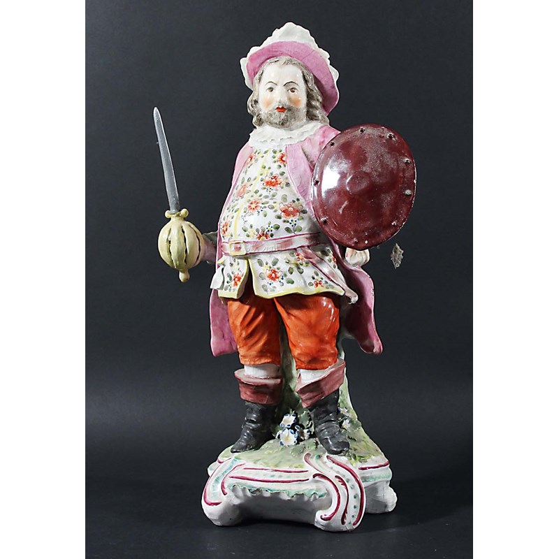 LARGE DERBY STYLE FIGURE OF FALSTAFF, standing holding a shield and sword on a scrolling base, height 39cm
