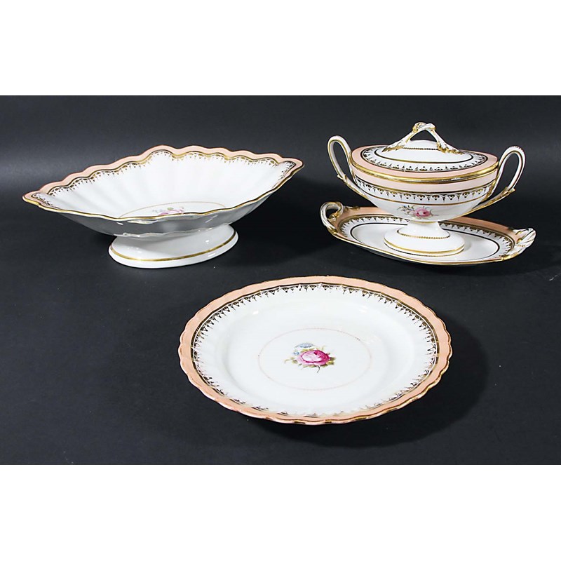 early 19th century, painting with Billingsley style roses inside a pale pink and gilt border, comprising saucer tureen, cover and stand, lozenge comport, navette shaped dish and ten plates, iron red marks (13)