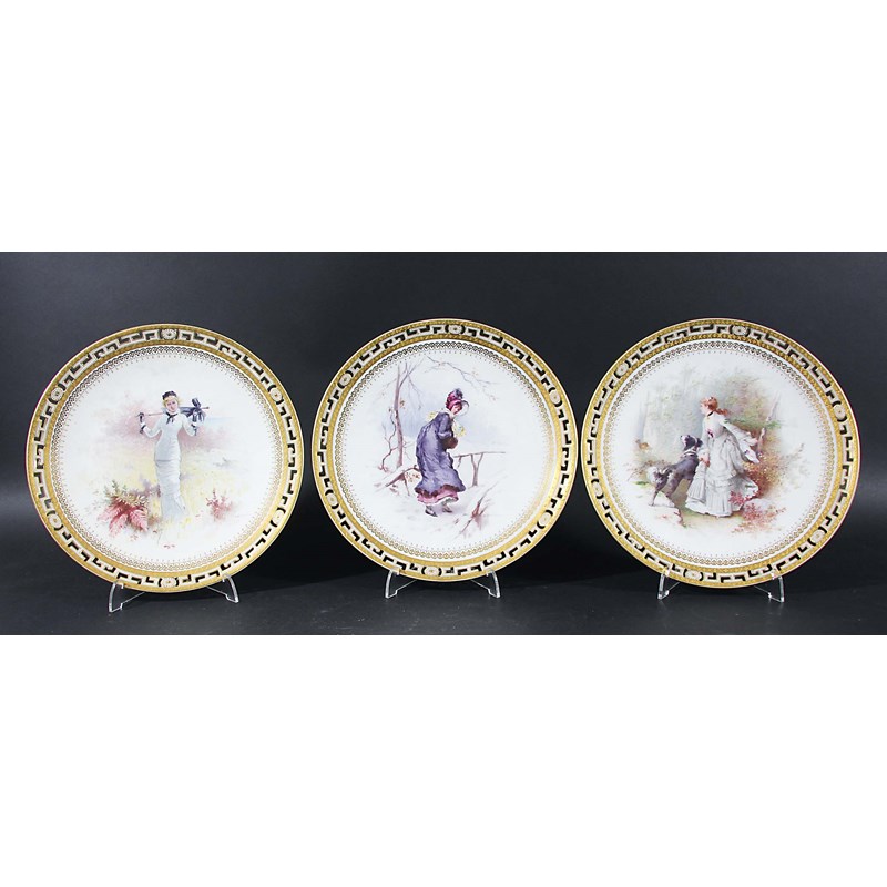 late 19th century, signed A (Anton) Boullemier, painted with scenes of young ladies inside a tooled gilt border and pierced and gilt border, iron red G4152, puce printed factory marks and impressed diamond registration mark, diameter 24.5cm (6)