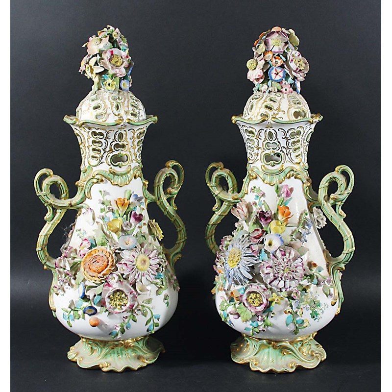 PAIR OF ENGLISH PORCELAIN FLORAL ENCRUSTED VASES AND COVERS,